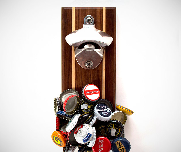 An absolute gem from DropCatch, the Stout Bottle Opener not only removes the bottle tops but sports 60 pounds of force to attract and stick up to 52 of them to its gorgeous walnut surface. Each opener is uniquely handcrafted in the U.S., with vertical maple inlays to compliment the genuine walnut base, all finished in a premium lacquer.