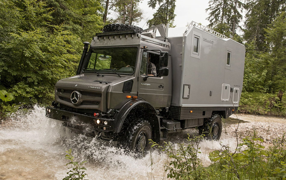 The Bimobil EX 435 Expedition Vehicle safely gets you through dirt roads, sand, snow, rubble, and any other high-altitude off-road excursion you choose to venture on. Built to aptly navigate even the most difficult terrain, it features high ground clearance portal axles, four-wheel drive, differential locks, and optional off-road reduction. Despite its size and power, the EX 435 has an economical, smooth running 170 kW/231 hp engine that is easy to maintain. The cabin is lightweight, yet extremely stable and has a bright, friendly style. Made with expert craftsmanship on Mercedes Unimog, the Bimobil EX 435 Expedition Vehicle withstands and excels in even heavy off-road use.