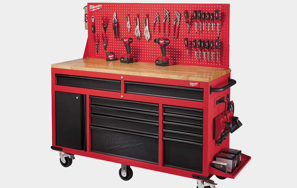 Get motivated with the Milwaukee Mobile Work Station, a workbench built to handle the biggest of of projects. It boasts an astonishing 24,199 cubic inches of storage space and enough tough to take a 2,200lb load. Features 11 soft sliding drawers, an adjustable work station of solid wood and a six-outlet power center, all finished in flame red.